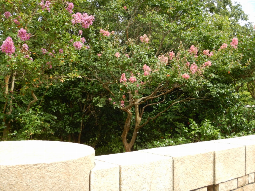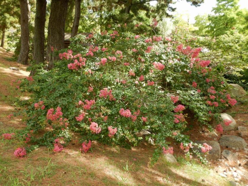 園内ではサルスベリ、シマサルスベリ、イッサイサルスベリがご覧いただけます。白、赤、濃桃、ピンクなどなど、ちょっとずつあります。(写真の場所は、一枚目は松の谷、二枚目は海見橋、三枚目は移ろいの庭周辺)