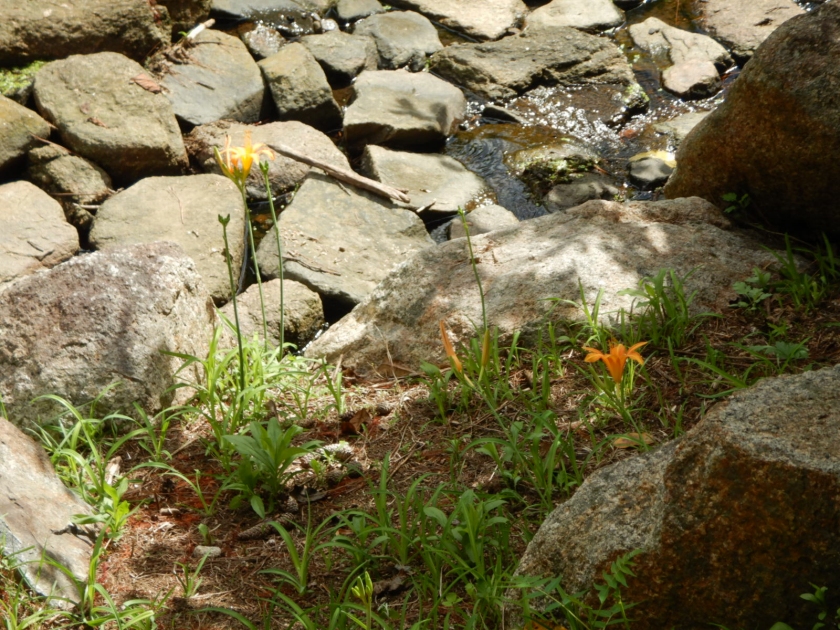 今日は川の両岸合わせて20本程度咲いていました。ノカンゾウは一日花(朝咲いて夕方しぼんで終わる花)なので、日によって開花数が違います。