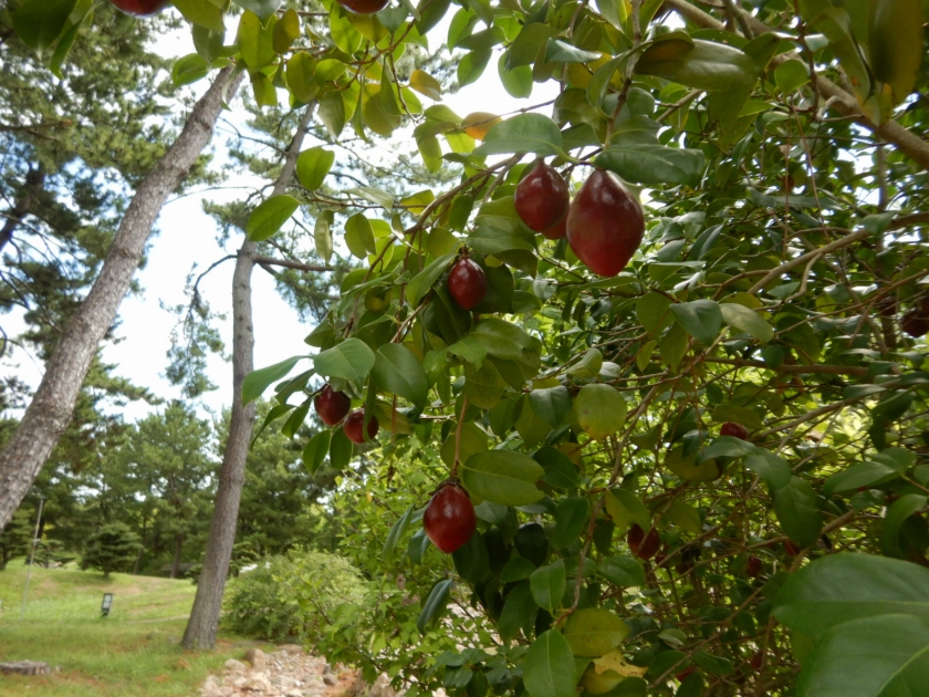 このくらいの時期から園内で目につき始める5㎝弱の真っ赤な実。おいしそう!ですがガッチガチに硬いのです。品種によって実の形が違うみたいですが、赤くなるのは一緒っぽい。