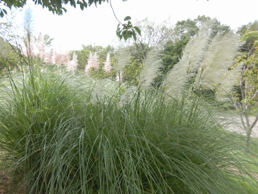 パンパスグラスやタカノハススキなどのススキ類が、モサモサし始めました。