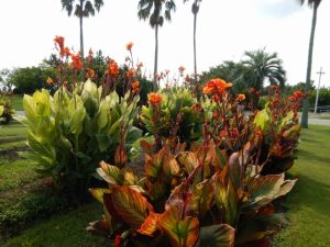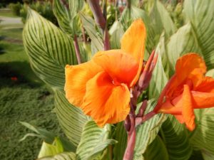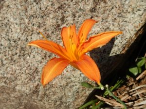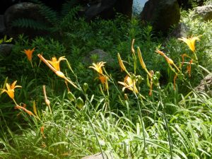 せせらぎ橋から灘川下流を見ると点々と見えるオレンジの花・・・のはずが、今日は開花数が少なくて川のそばに行って見られる程度でした。一日花のため、日によって開花数がマチマチです。