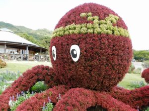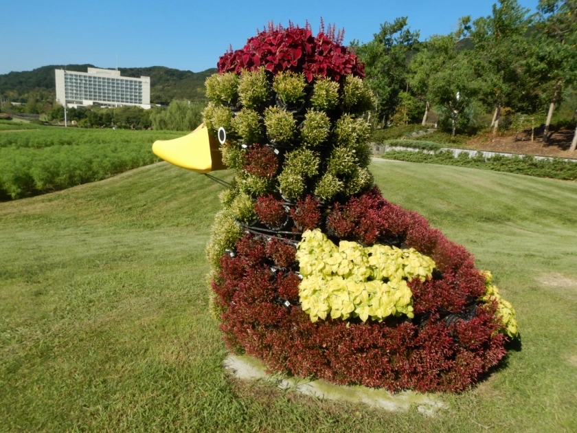 立体花壇「タコトピアリー」(場所:東浦口ゲート前)と「アヒル」(場所:大地の虹北花壇