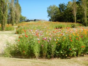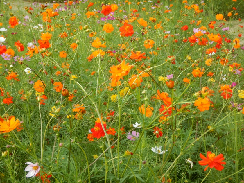 ポプラの丘は順調に開花しつつあります。上段に植わっているコスモスは、早い時期に開花するものから遅い時期に開花するものまで、多種多様な品種のミックスです。現在は早い時期に咲くキバナコスモスが目立っており、オレンジ色に染まっています。咲き進んでいくとピンク系が増えてきますので、オレンジ色の状態を楽しみたいなら今!です。