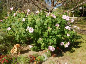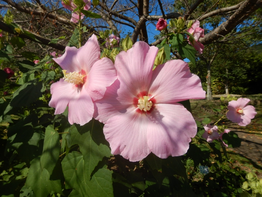 去年の台風で多数折れ、残り本数は少ないです。しかし手のひらサイズの大きな花で目立つためご紹介しておきます。近くにスイフヨウ(酔芙蓉:咲き始めは白い花で、徐々に色付き夕方にはピンクになる)の木も1本あります。