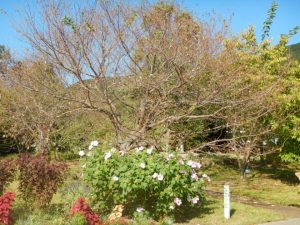 先ほど紹介したフヨウの後ろにある大きな木がアーコレードです。チラホラ程度ですが、開花が見られ始めました。