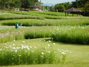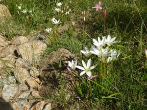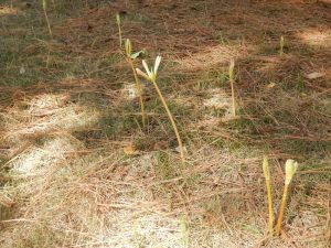 一足お先に開花していた松の谷の方はほぼ終わり、チラホラ数本残っています。ゼフィランサスはまだ咲いていました。花の谷側の園路そばではシロバナマンジュシャゲが9本咲く準備中で、これから開花します(写真6枚目、まん中に横切る園路沿い手前)。