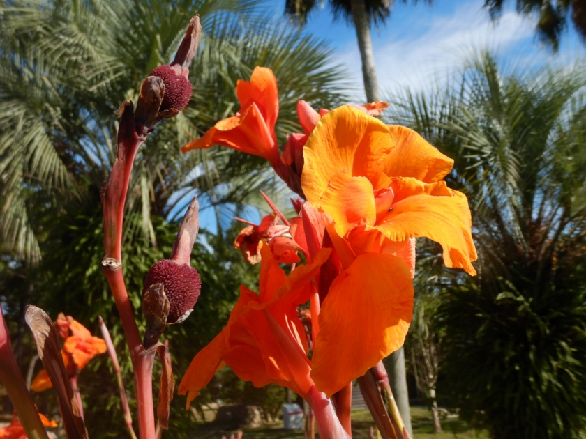 夏からずーっと変化ない気がしていましたが、見下ろせた花の位置がいつのまにか頭上を越え、面白い質感の実も楽しめるようになっていました。葉っぱも縞々模様できれいですよ。