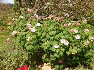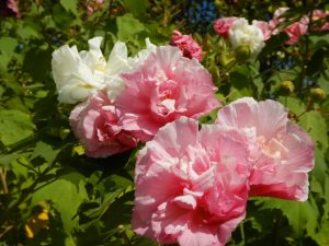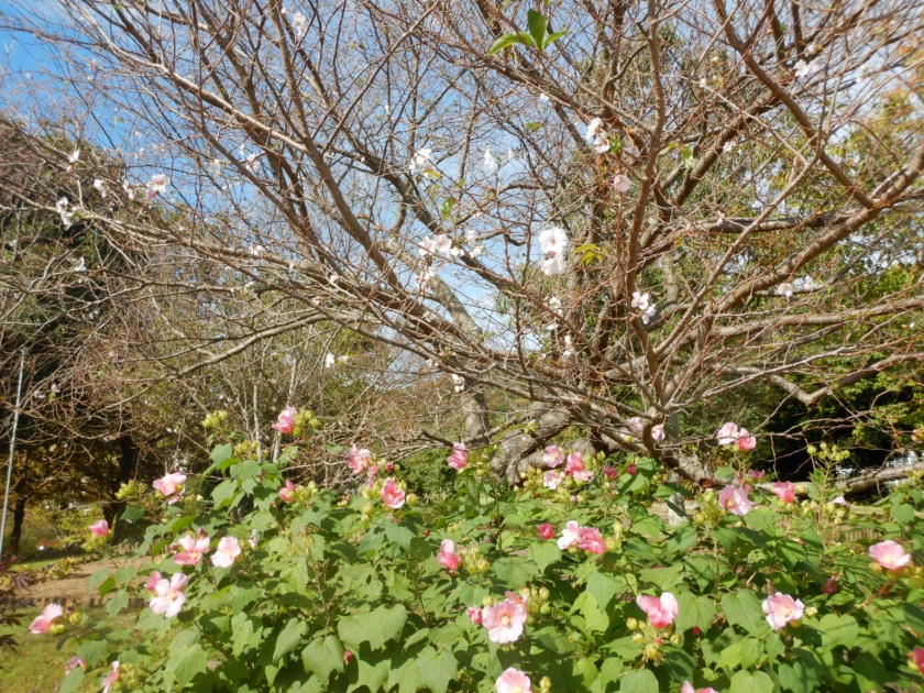 去年の台風で多数折れ、フヨウの残り本数は少ないです。ピンク色のほか白色の花もあります(写真一・二枚目)。