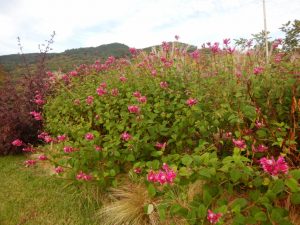 前回までご紹介していたアーコレードの奥でウォーウィックのお花が開花中です