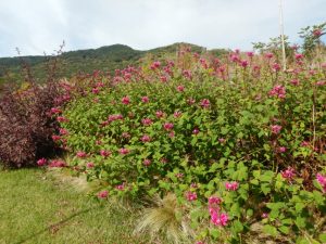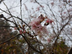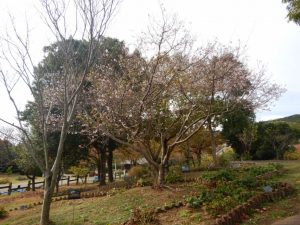 春と秋に二度咲くサクラが花の丘道・花の谷で数本開花中です。写真は花の丘道のウォーウィックのお花。