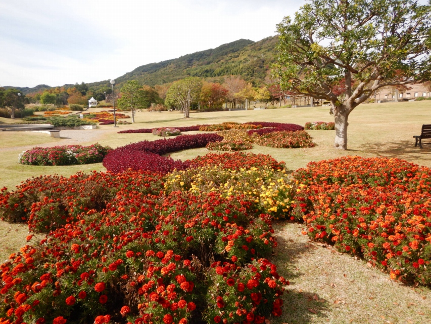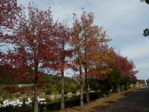モミジバフウ(船着き場他)やメタセコイヤ(パームガーデン他)など木々の葉っぱが赤や黄色に色付いています。