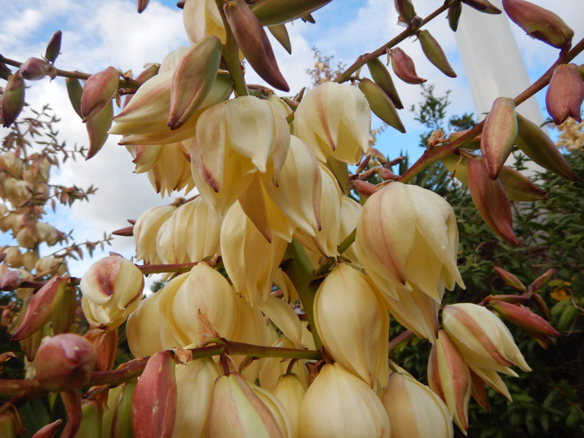 海岸口ゲート前のノジギクの隣に、地表から2メートルくらいの高さまでニョキッと花茎が伸び、鈴みたいなお花が咲き始めました。たくさんつぼみがついているのでこれからどんどん咲いてきます。巫女さんが持って舞う鈴みたいな繊細な見かけなのに、大きくて大迫力です。