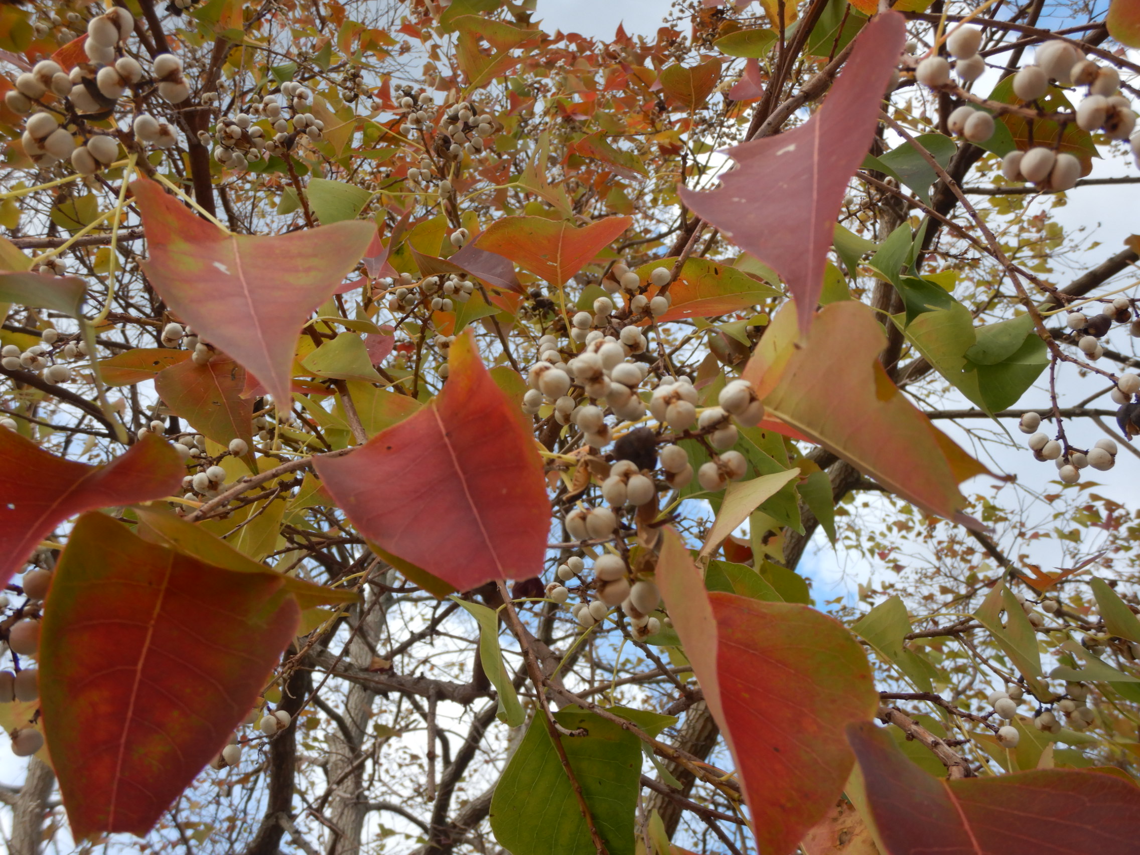陽だまりの丘のラクウショウは黄~橙を超えて赤茶色に変わりました。
