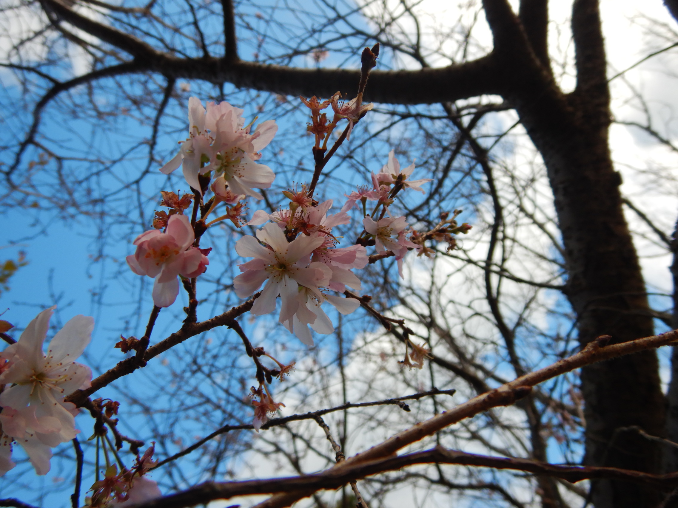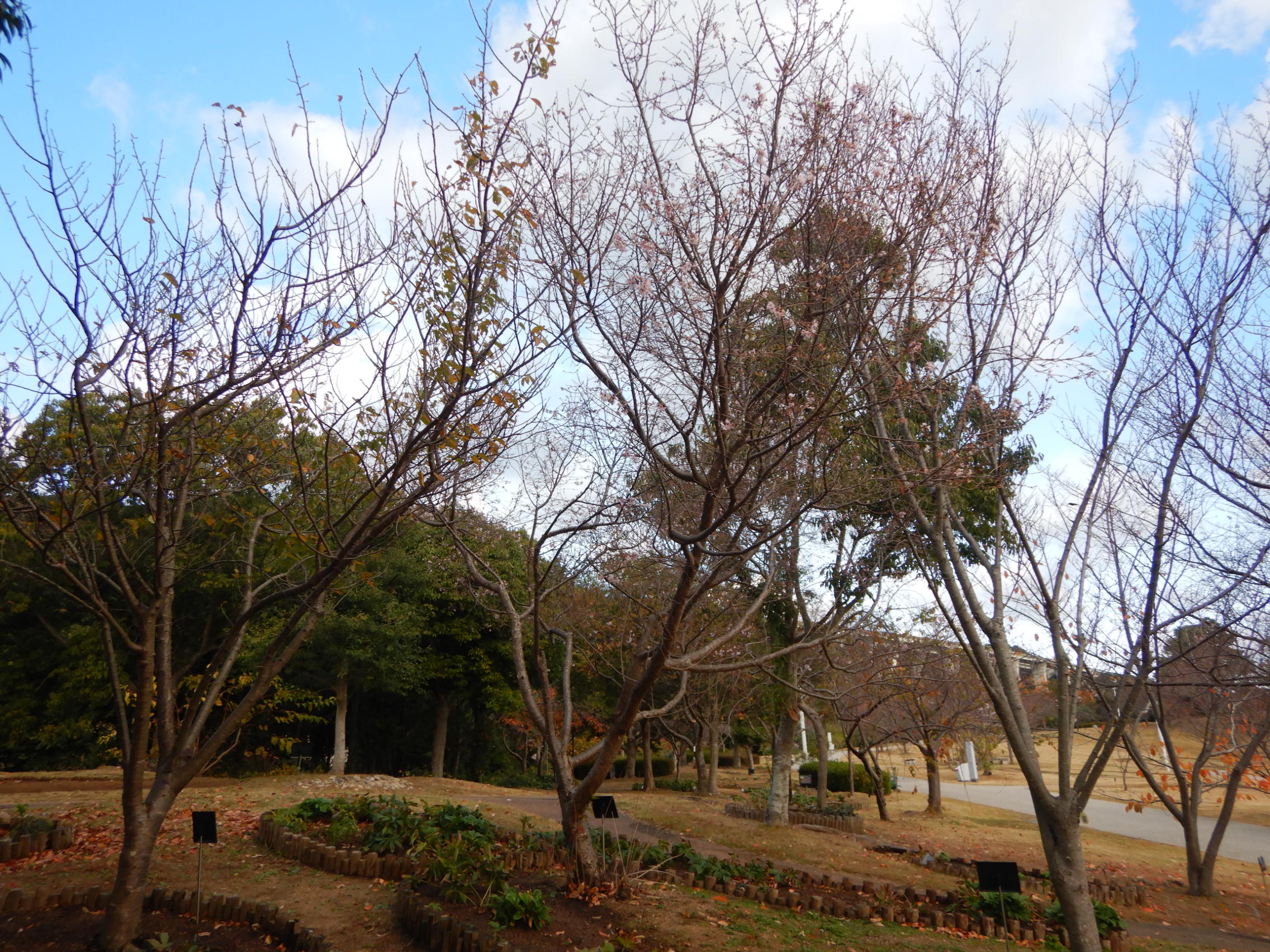 春と秋に二度咲くサクラが花の丘道・花の谷で数本開花中です。寒さが増してきたので花数は減ってきました。