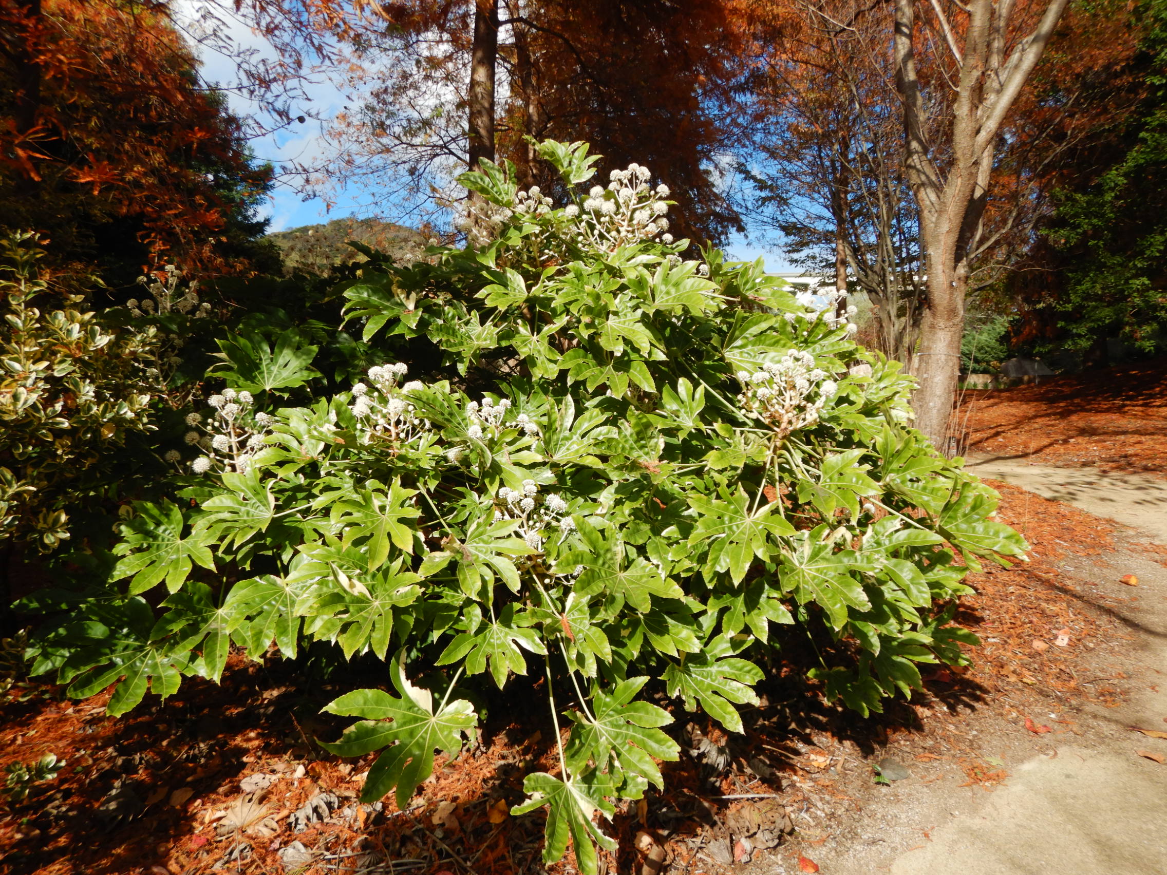 手のひらみたいに切れ目のある大きな葉っぱが特徴のヤツデのお花が咲き始めました。花は花火が開いたみたいな形をしています。匂いによってくるのか虫たちがまわりをぶんぶん飛んでいます。