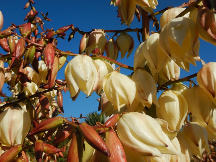 海岸口ゲート前のノジギクの隣に、地表から2メートルくらいの高さまでニョキッと花茎が伸び、鈴みたいなお花が咲き始めました。たくさんつぼみがついているのでこれからどんどん咲いてきます。巫女さんが持って舞う鈴みたいな繊細な見かけなのに、大きくて大迫力です。