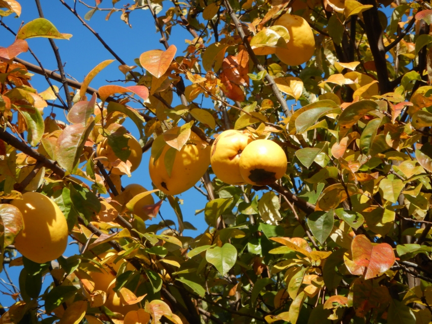 写真一・二枚目:陽だまりの丘のラクウショウ、二・三枚目:花の谷のカリン、三枚目:花の谷のハクサンボクの赤い実、四枚目:子供の森周辺のナンキンハゼの白い実