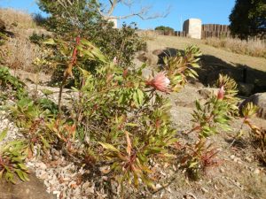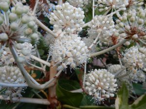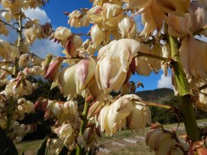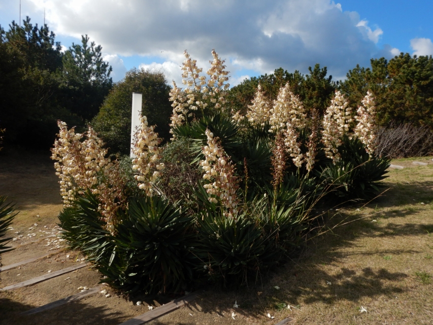 海岸口ゲート前のノジギクの隣に、地表から2メートルくらいの高さまでニョキッと花茎が伸び、鈴みたいなお花が見ごろです。巫女さんが持って舞う鈴みたいな繊細な見かけなのに、大きくて大迫力です。