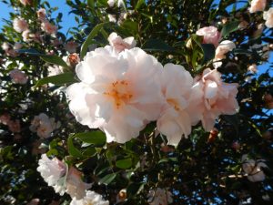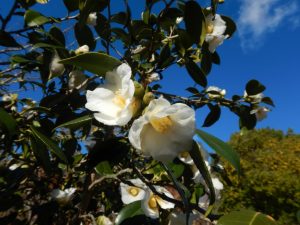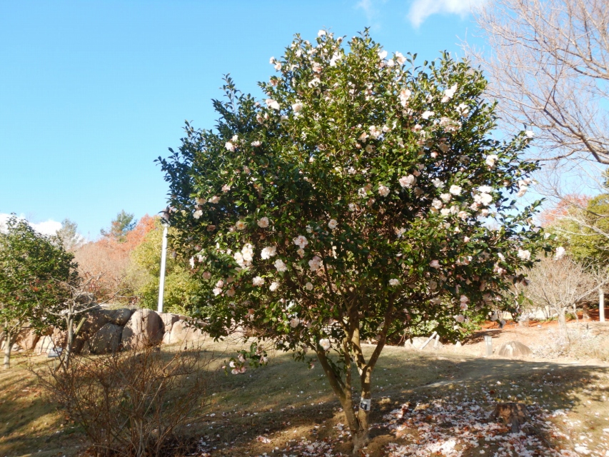 花の谷園路沿いに1本、大きなお花をつけたサザンカが見ごろです。