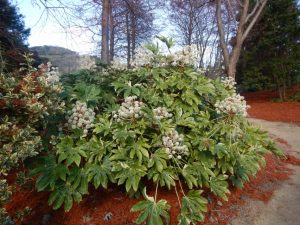 手のひらみたいに切れ目のある大きな葉っぱが特徴の花木です。花は花火が開いたみたいな形をしています。匂いによってくるのか虫たちがまわりをぶんぶん飛んでいます。