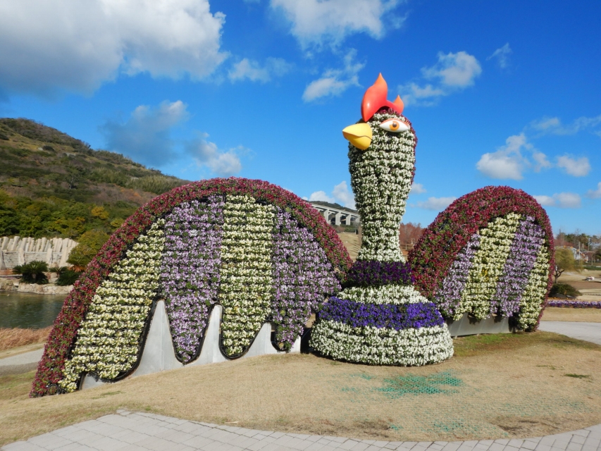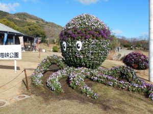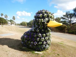 写真一枚目:大地の虹の花火鳥、二枚目:大地の虹のアヒル、写真三枚目:ビオラの花、四枚目:東浦口ゲート前タコトピアリー