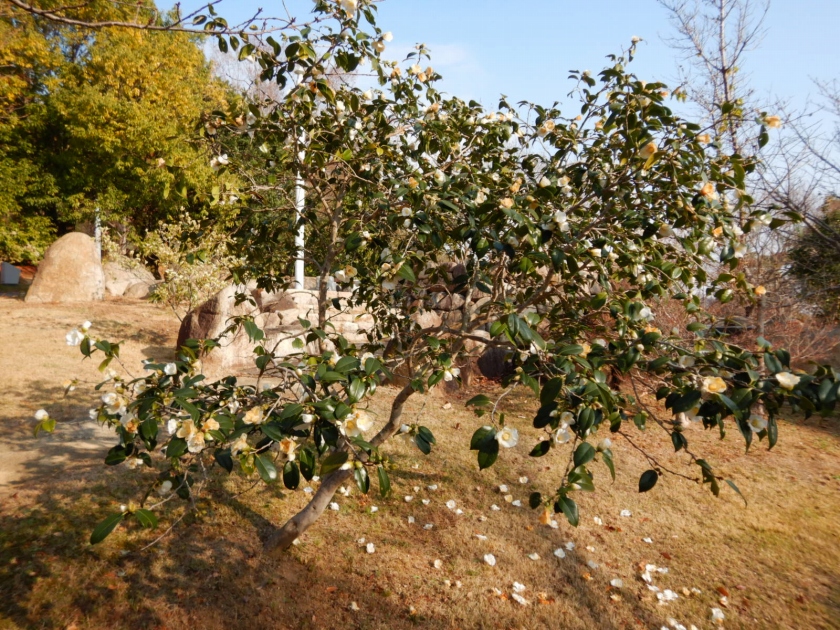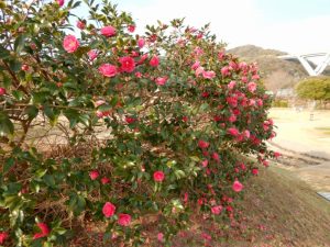 移ろいの庭の小高い丘やボート乗り場そばで咲いているカンツバキ(一・二枚目)。