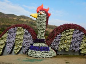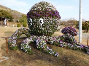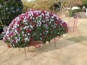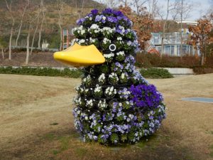 写真一枚目:立体花壇「花火鳥」、二枚目:立体花壇「アヒル」、三・四枚目:立体花壇「タコトピアリー&鯛」
