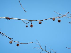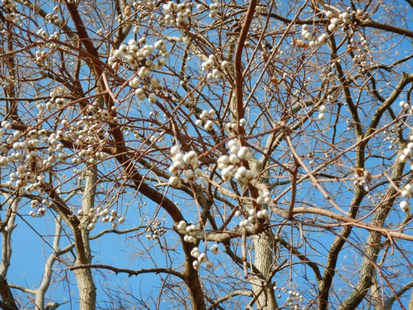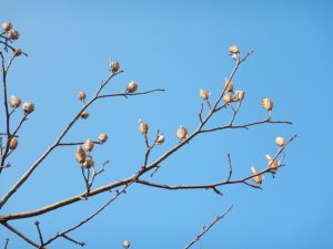 この時期の大型花壇は春に向けての準備のため、ほとんどお花がありません。しかし冬ならではの園内植物の楽しみ方もあります。葉っぱが落ちて目立つようになった木の実や、木々によって異なる枝ぶり。晴れた日の青空との対比はきれい、というよりカッコイイですよ!