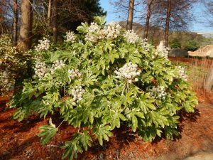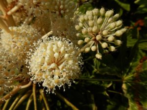 小さなまん丸い花が複数集まり、球状になっているお花。ハナバチに大人気で取り巻きいっぱいです。よほど危害を加えない限り刺さないハチですので、怖くなければ近くでご覧ください。