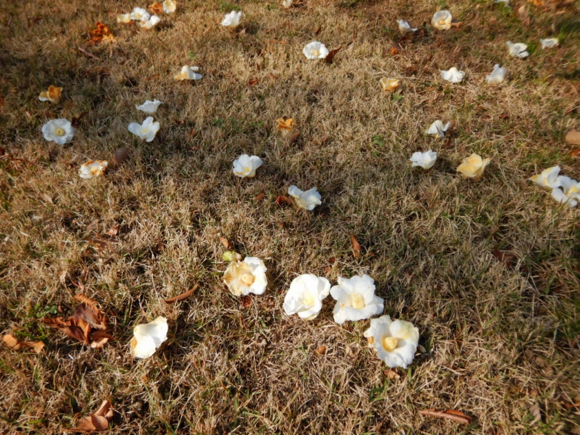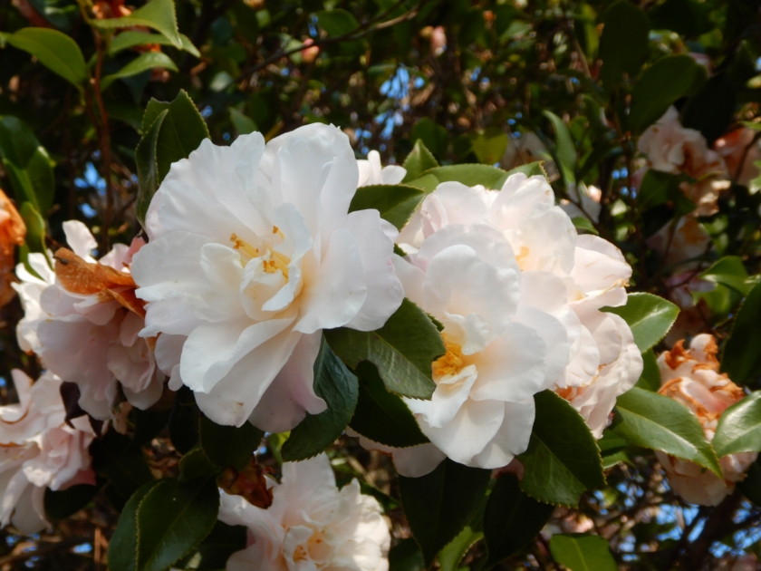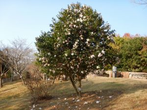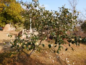 花の谷と松の谷の間の園路沿いには、ヤブツバキやワビスケ(三・四枚目)が何本かありますが、たった1本しかないサザンカ(五・六枚目)が一番目立っています。