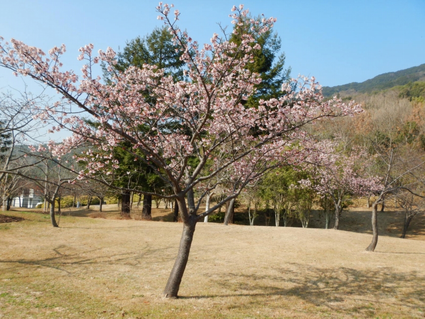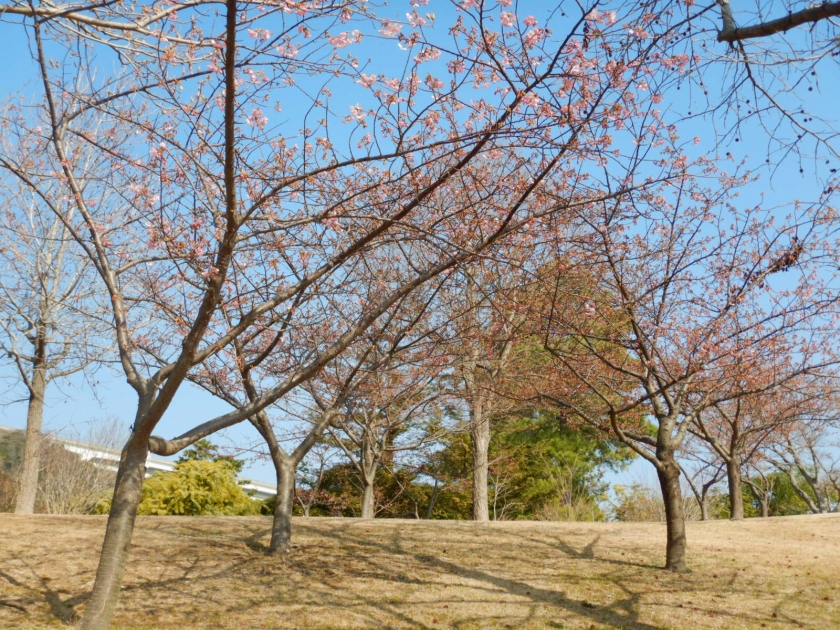 園内に約120本ある河津桜ですが、12日に開花(※当公園の標準木で5輪の花を確認)しました。今日の時点では、全体としては1本の木につき数輪咲いている感じです。春一番の丘よりも月のテラス周辺の方が開花数は多めですが、春一番の丘にはすでに三分咲きくらいの木も1本あります。