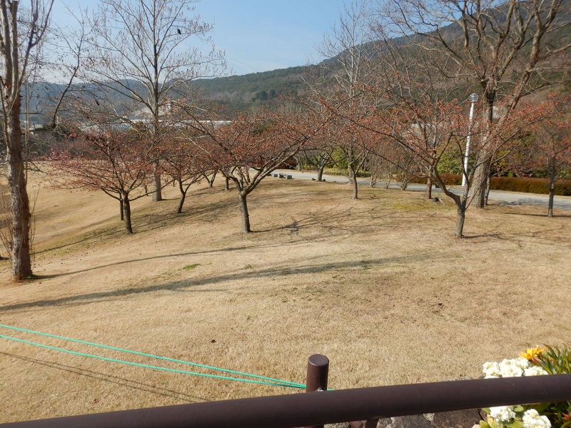写真一~三枚目:月のテラス周辺、四枚目:春一番の丘の入口、五枚目:数輪咲いている様子、六枚目:三分咲きくらいの木