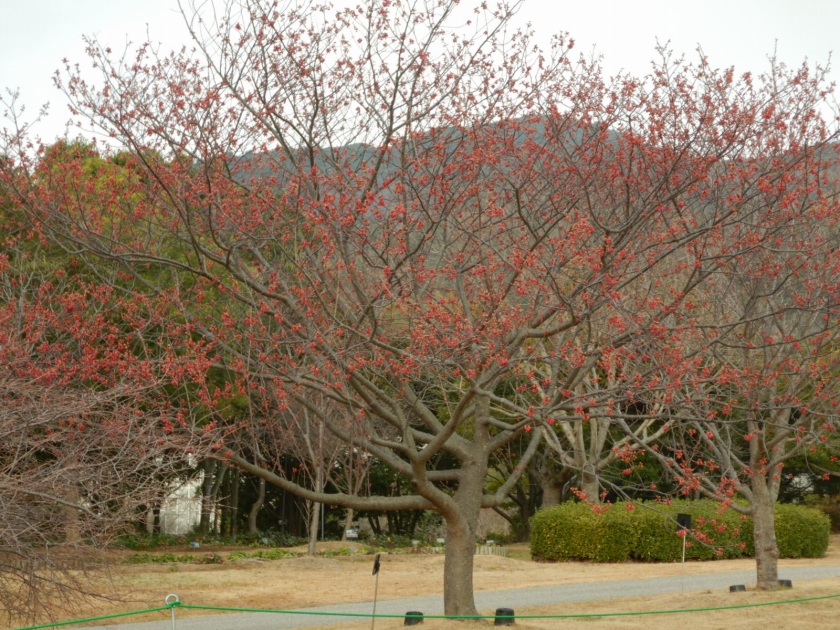ポプラの丘上段にある1本の大きな木。半開きの花があっちこっちに。赤いので咲いてなくても存在感あり。
