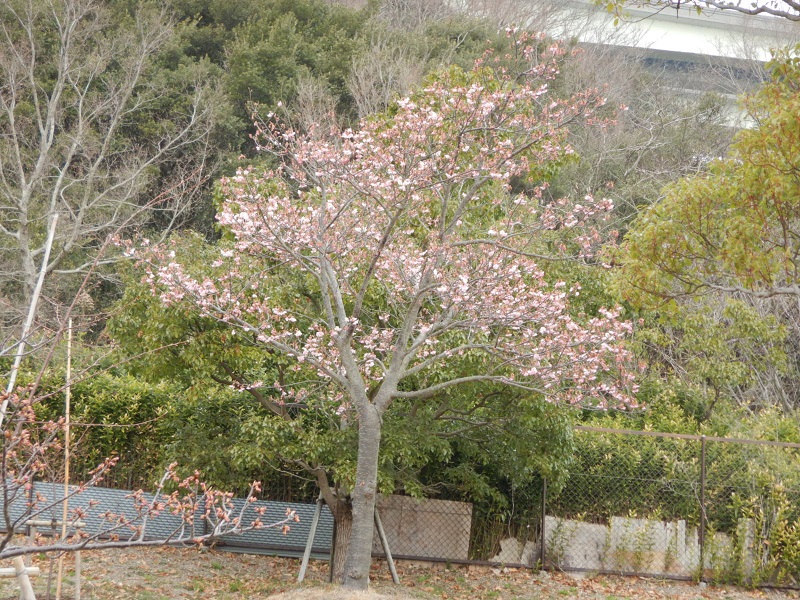 冬に咲く桜、カンザクラ。多数植わった桜の中にたった2本しかありませんが、きれいに満開です。