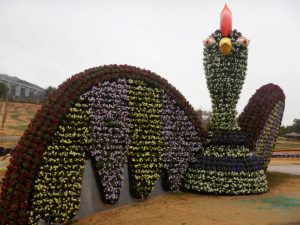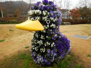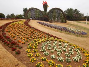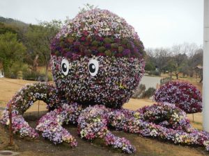 写真一・二枚目:立体花壇「花火鳥」、三枚目:立体花壇「アヒル」、四枚目:立体花壇「タコトピアリー&鯛」