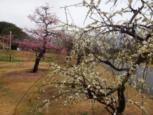 12本の梅がきれいに咲いていますが、雨で散り始めています。