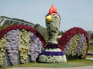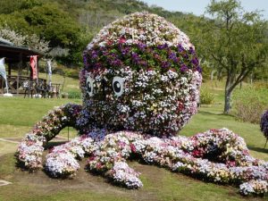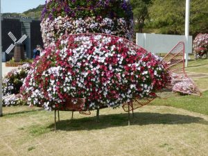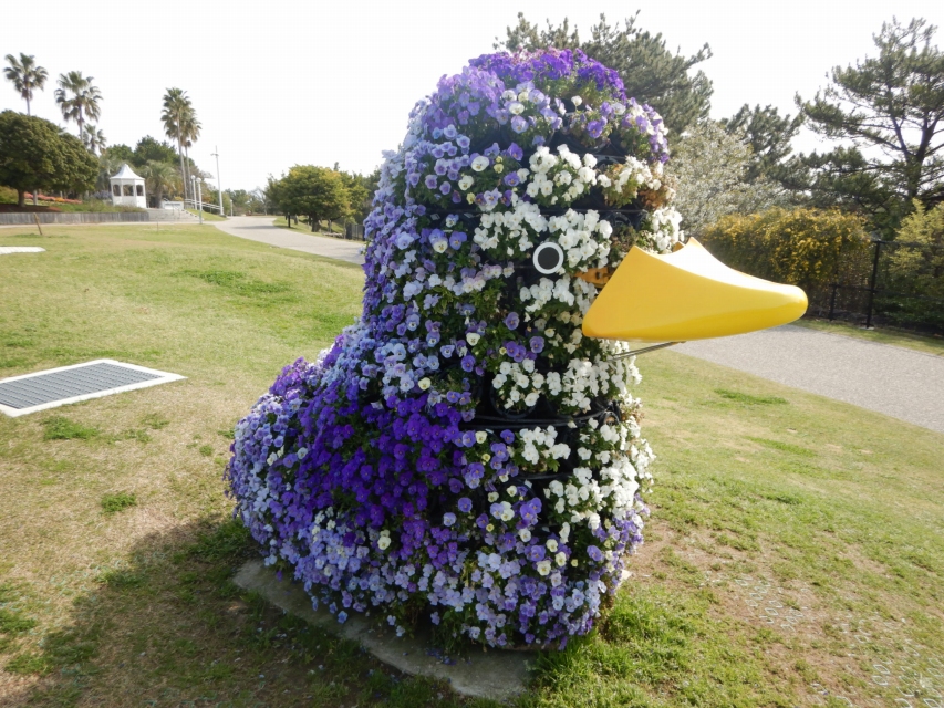 写真一枚目:立体花壇「花火鳥」、二枚目:立体花壇「アヒル」、三・四枚目:立体花壇「タコトピアリー&鯛」