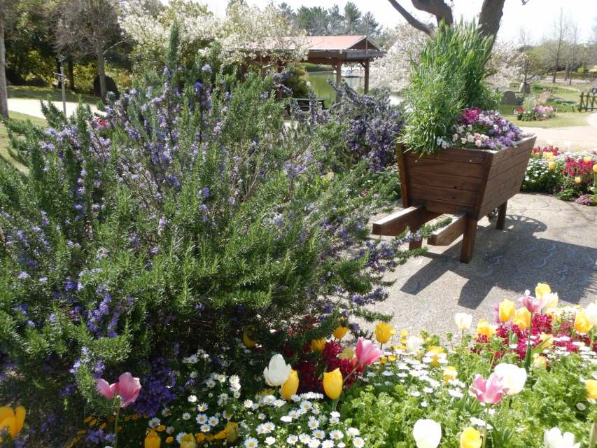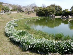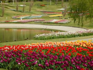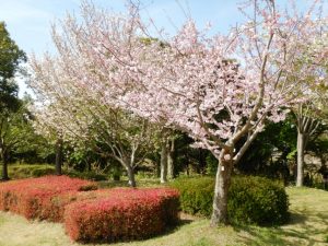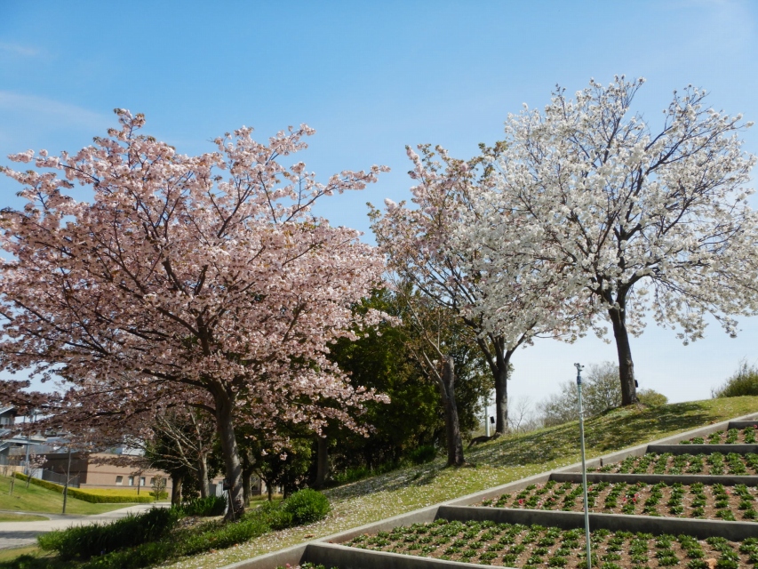 チューリップが咲いているポプラの丘周辺のほか、淡路口ゲートから近いせせらぎ広場と花の谷いう場所で数多くのサクラが咲いておりますので、淡路口駐車場に車を停め、園内のんびり一周散策をお勧めします。