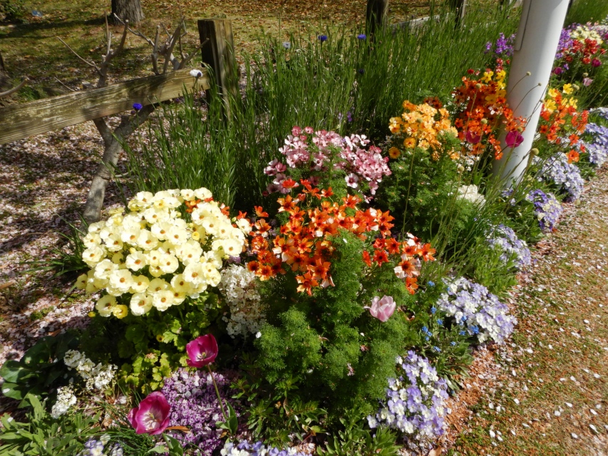ビオラがきれいに咲きそろい、色がクッキリしています。巨大な花火鳥と一緒に写真をどうぞ。自分が小粒に見えますよ。