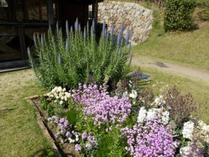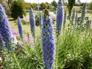 胸の高さくらいまであるツンツンニョキニョキですが、まだ数は少ないのですが青く咲き始めました(写真はレストラン花屋敷の横)。この植物の名前、つっかえずに読めるかな?