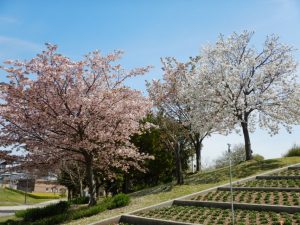写真一枚目:「木の花桜」と「白雪」(場所:移ろいの庭階段花壇の横)、二枚目:「渡辺桜」と「思川」(場所:ポプラの丘上段)