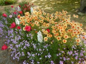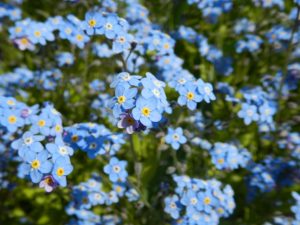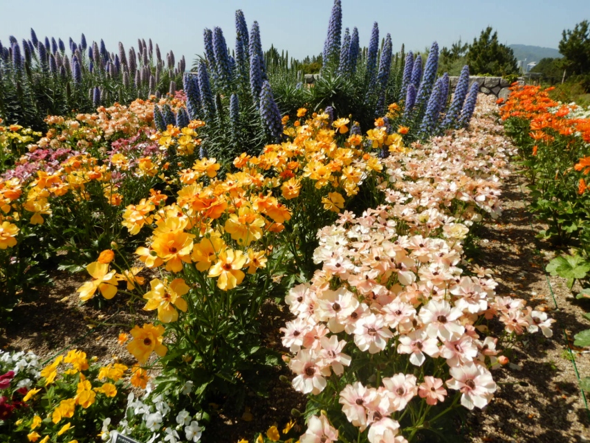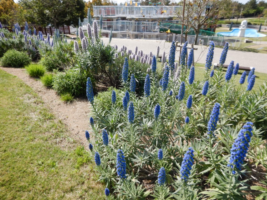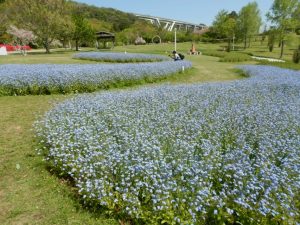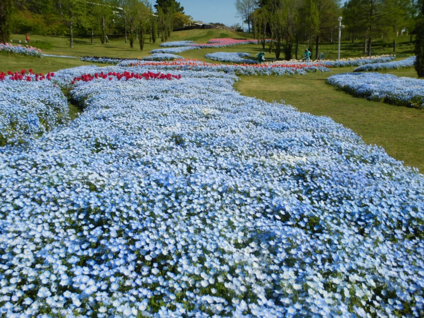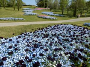 ポプラの丘上段の3つの花壇だけ、ネモフィラより若干濃い青が。それがワスレナグサです。これはこれできれいですよ。