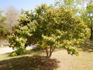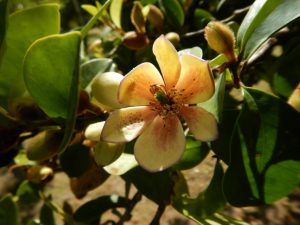 花の丘道でそこはかとなくバナナの香りがしますが、それはカラタネオガタマの花の香りです。香りを楽しむなら午後ですよ。花自体は地味なので見つけられないかもしれませんので、鼻で花を感じてね。