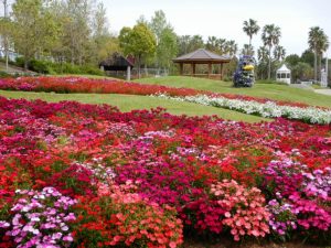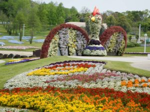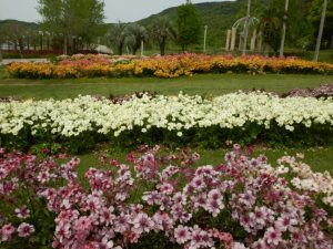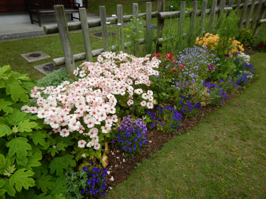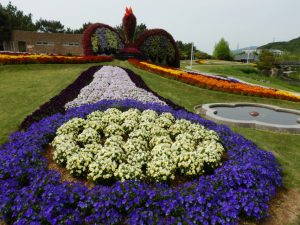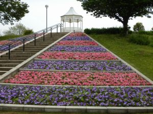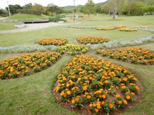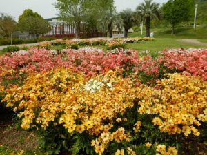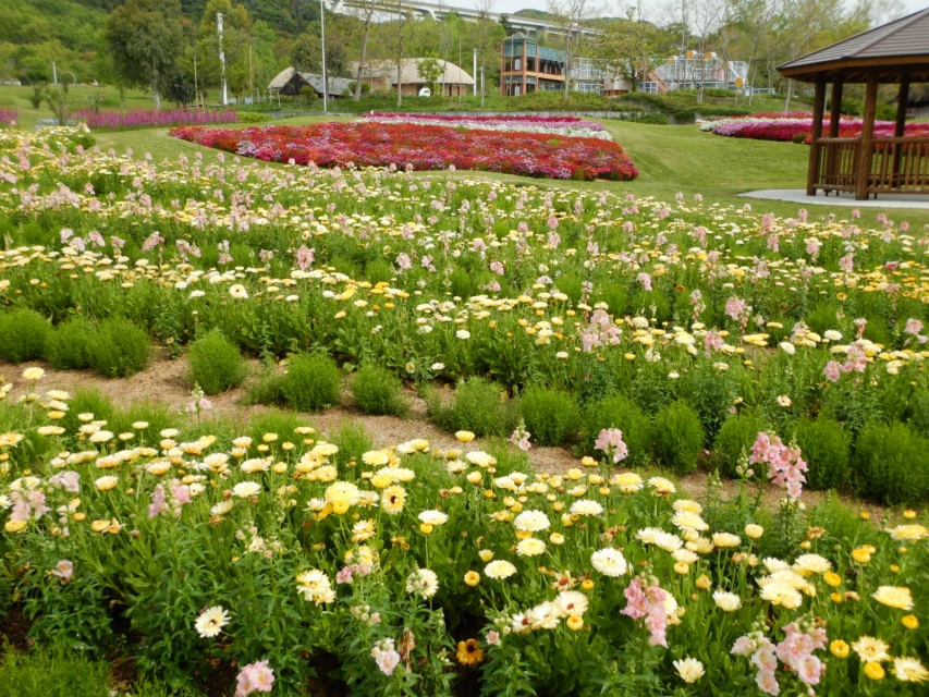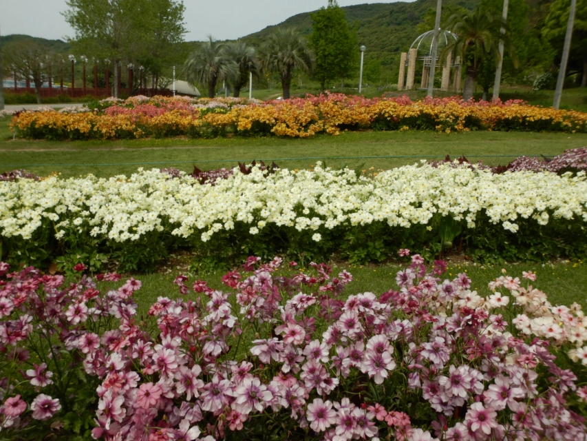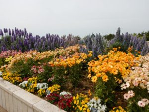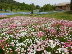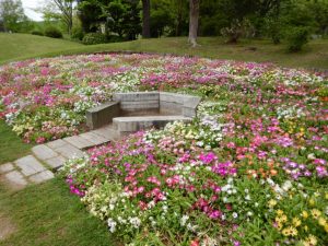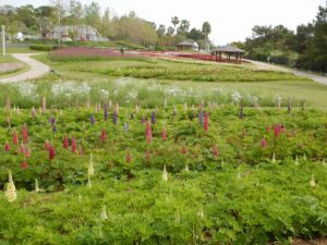 大地の虹北花壇で、いろいろな花が華やかな景観を作り始めています。今でもなかなかですが完成が楽しみ。