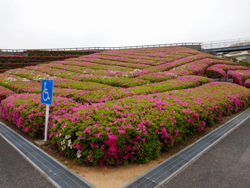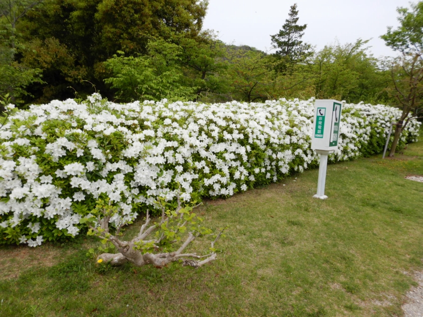淡路口駐車場から入園しようとすると、山のようなツツジ軍団が見られます。GW後半には、ピンクに染まった山が見られると思います。でも個人的にお気に入りのツツジは、ポプラの丘の上の方に見られる白ツツジの一列。遠くから見るとカマボコっぽいんですよね(お昼ご飯前に見たせいか?)。