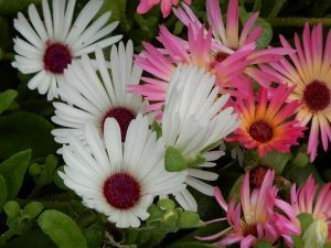 太陽が当たるとキラキラのお花が開くリビングストンデージーが今まさに見ごろなのです、が、が、が!青空の見える日以外は咲いていませんので悪しからず。今日は曇りでしたので、イマイチな感じの写真になっています。