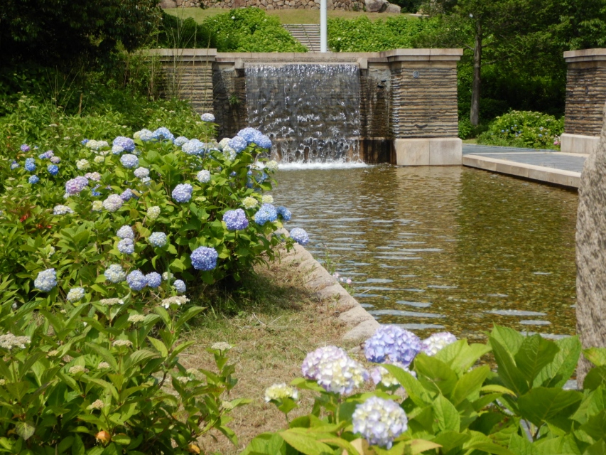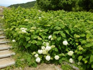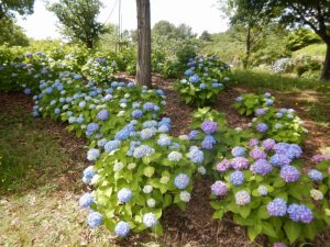 空のテラス入り口、せせらぎ広場の一部で四季咲きアジサイが、また空のテラス周辺でヒメアジサイが咲き始めています。真っ白大輪で人気のアナベルは開花時期が多少遅く、現在殆どが小さいつぼみですが、ピンポイントで咲いている部分があります。
