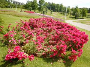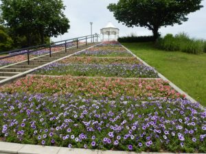 ポプラの丘の上段では、6区画分の花壇にゴデチアが咲いています。27,28日の大雨で早くも散ってしまった部分、倒れた部分もありますが、まだきれいな部分もありますので是非ご覧ください。