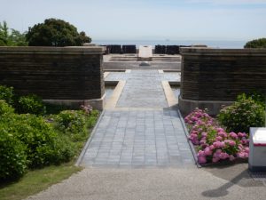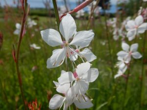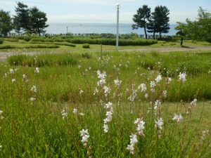 風にユラユラ白い蝶が飛んでいるような花、ガウラが咲き始めました。これから秋まで咲き続けます。海岸口ゲートそばは、天気のいい日はお花と一緒に海がきれいに見えますよ。