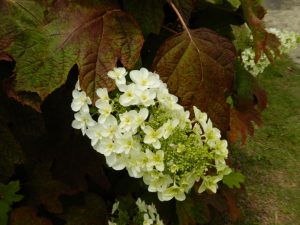 葉っぱがカシワの葉っぱの形に似ているカシワバアジサイ。花は盛り塩かドリルか、といった攻めた形状です。